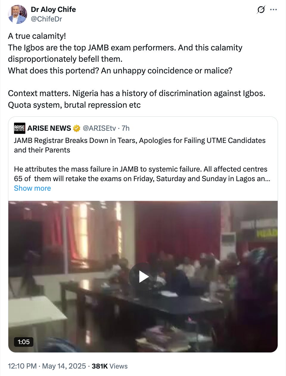 Nigeria is a deeply fragmented country, divided along ethnic, tribal, and religious lines. In recent years, tribalism and discrimination among its various groups have intensified, largely due to political factors. One clear implication of JAMB’s incompetence (beyond the tragic loss of life it has already caused) is the acceleration of distrust amongst all of our tribes, and the further fragmentation of our national fabric.