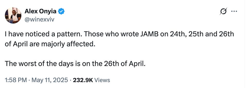 To put this in perspective, the average age of a JAMB candidate is 16 years, and a number of exam centers were situated far from students’ homes. Transportation is often difficult, and safety (in today’s Nigeria) cannot be taken for granted. And as you can imagine, the stress and disruption caused by such early reporting times are significant, especially for teenagers facing one of the most important exams of their lives. Yet, in our true Nigerian fashion, despite these advertised arrival times, the exams still started late at several centers, exerting another layer of frustration on the poor candidates. When the exams finally ended (despite the widespread complaints), the release of results was scheduled for May 5.