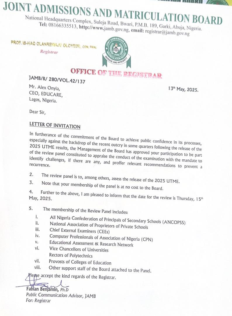 The mounting social, media, and legal pressure led JAMB to formally invite Onyia (on 13th of May) to participate in a transparent review of the 2025 UTME. He was asked to join a panel tasked with appraising the conduct of the examination, and identify challenges.