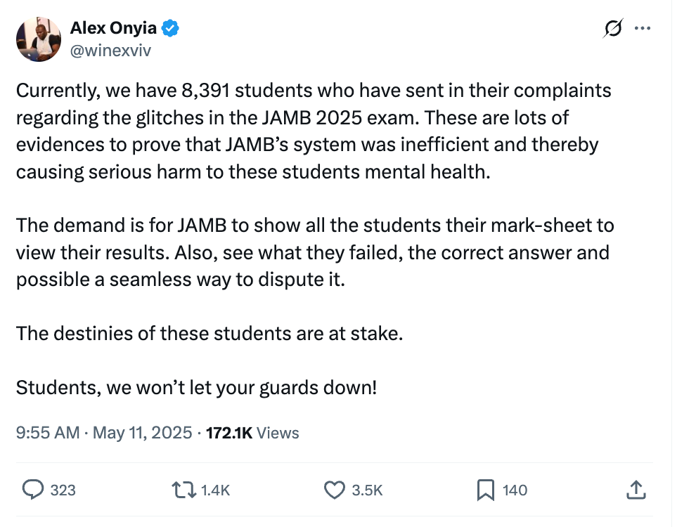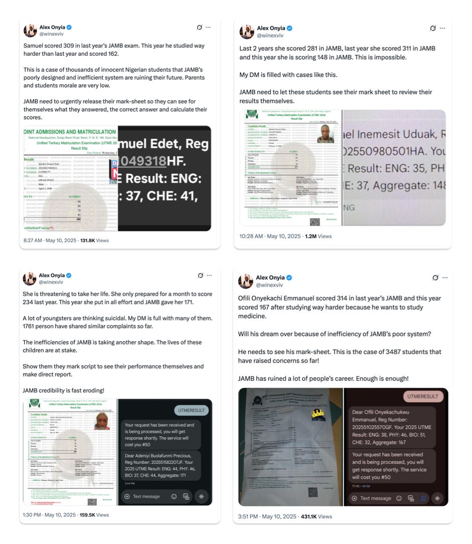LinkedIn describes Alex Onyia as a graduate of the University of Nigeria, Nsukka, and the CEO of Educare (a leading K-12 education technology platform in Africa). Confronted with widespread complaints about technical glitches and inexplicably low scores in the UTME, Alex began to leverage his large following and expertise to organize a collective response.