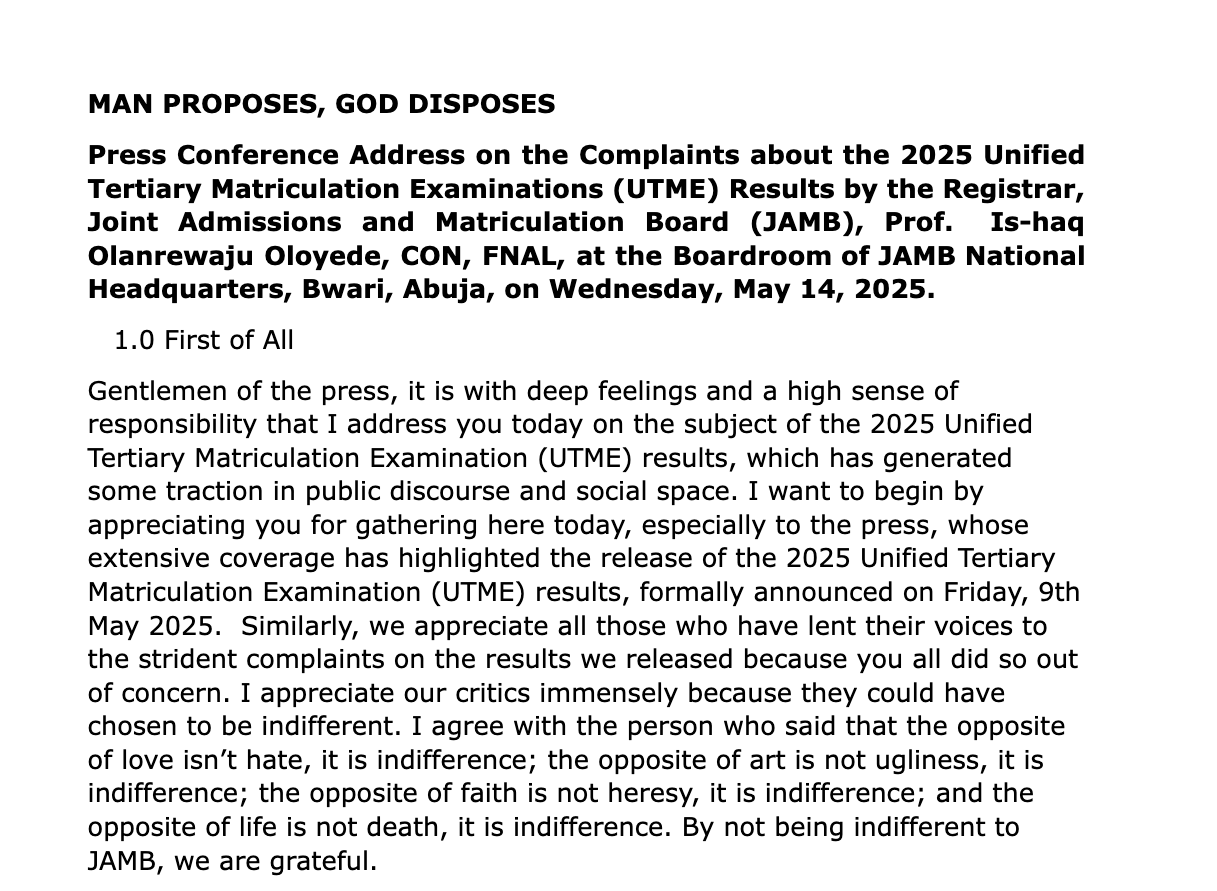 In a display that was as comical as it was tragically embarrassing, JAMB finally convened a press conference on May 14, 2025, led by its Registrar, Prof. Is-haq Olanrewaju Oloyede, in Bwari, Abuja. Rather than accept responsibility for a failure of this magnitude (as would be expected in other countries) an apparently overwhelmed Oloyede chose not to resign. Instead, he shed a few crocodile tears 7 and delivered a speech (in classic Nigerian fashion) titled “Man Proposes, God Disposes.”