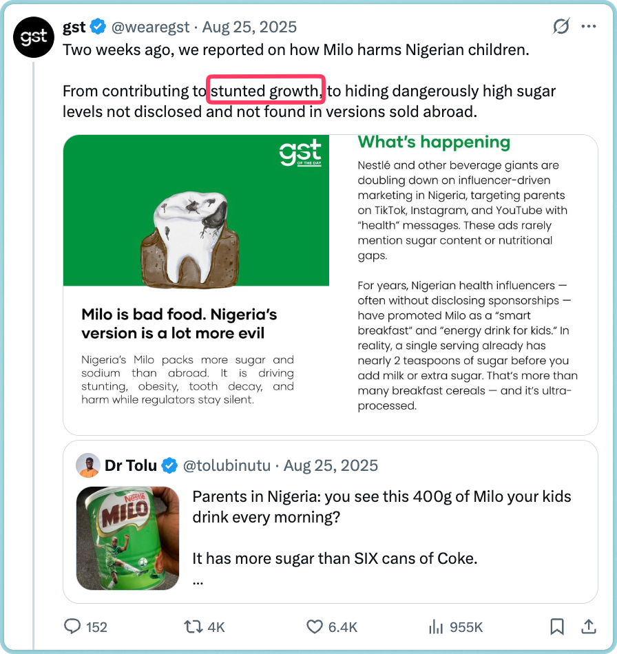 But GST’s framing: “Nigeria’s Milo is mostly sugar,” “it is driving stunting”, implies a direct causal relationship between Milo consumption and malnutrition that the evidence does not support. Worse, by attaching Nestlé’s product to Nigeria’s most emotionally resonant public health crisis [child malnutrition], the campaign risks becoming an agenda that, if internalised by parents who can actually afford Milo, could prompt them to substitute it with products offering less nutritional value, or simply reduce caloric intake in an already food-insecure environment.