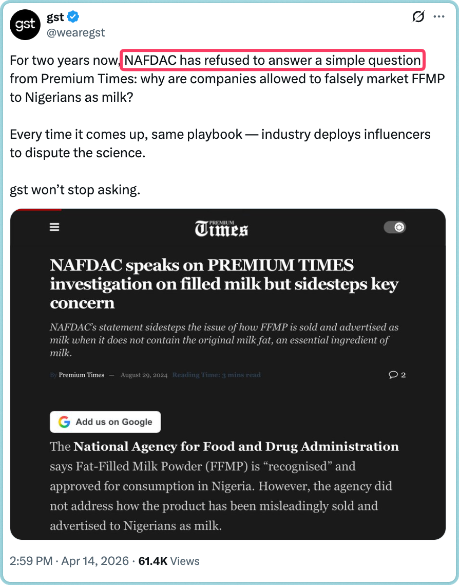 The campaign’s key claim (April 14, 2026) is: “Most Nigerians think they are drinking milk. They are drinking Fat-Filled Milk Powder (FFMP). In the EU, FFMP can’t be sold as milk, it must be labelled as a milk ingredient, not a dairy product. Here, it’s ‘milk’. Nigerians are eating what others aren’t allowed to call food.” An accompanying graphic labels Nigeria “a dumping ground for substandard milk.”